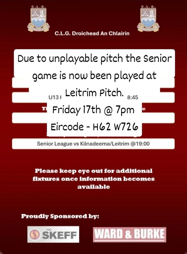 Due to an unplayable pitch, the Senior game has been moved to Leitrim Pitch.