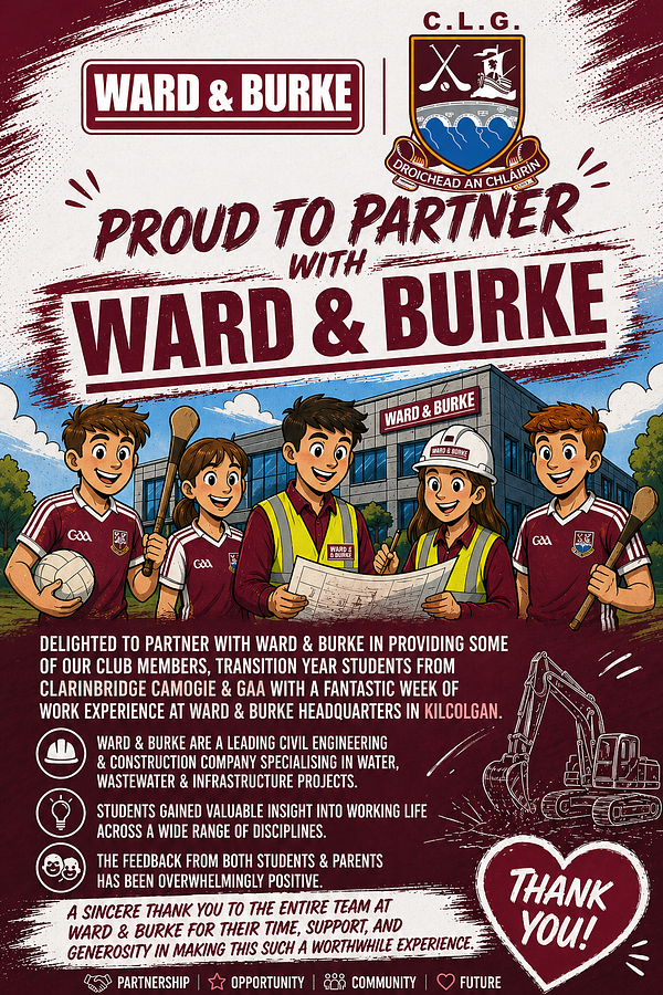 Delighted to partner with Ward & Burke in providing some of our Club members, Transition Year students from Clarinbridge Camogie & GAA with a fantastic week of work experience in at Ward & Burke headquarters in Kilcolgan.